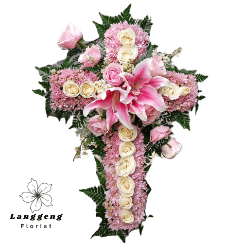 Perpaduan warna pink dan putih dalam bentuk salib memberikan nuansa belasungkawa yang lembut dan penuh kasih. Standing Flower Salib ini dirangkai dari mawar putih, mawar pink muda, lili pink, dan krisan pink, disusun simetris membentuk salib elegan dengan dedaunan hijau sebagai bingkai alami.