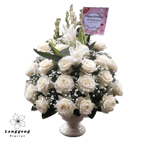 Rangkaian bunga meja ini memancarkan kesan damai, suci, dan penuh penghormatan. Perpaduan elegan antara lily putih mekar, mawar putih, dan bunga-bunga aster yang halus, menciptakan komposisi indah yang cocok untuk berbagai momen spesial — mulai dari ucapan belasungkawa yang penuh simpati, doa untuk orang terkasih, hingga dekorasi bernuansa tenang.