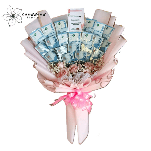 Hadirkan hadiah yang elegan dan berkesan dengan Buket Uang Pink dari Langgeng Florist Bekasi. Buket ini dirangkai dari 20 lembar uang pecahan Rp50.000 milik customer, dibalut dengan kertas wrapping warna pink soft, dilengkapi mawar pink muda segar dan baby’s breath putih, menciptakan tampilan feminim, anggun, dan eksklusif.