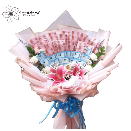 Tampilkan kesan mewah dan penuh cinta dengan Buket Uang Campuran Lily Pink dari Langgeng Florist Bekasi. Buket ini dirangkai dari kombinasi uang pecahan Rp100.000, Rp50.000, dan Rp2.000 milik customer, dihiasi bunga lily pink besar, mawar putih, dan baby’s breath, serta dibalut wrapping pink muda berlapis, dengan pita satin biru yang menambah keanggunan.