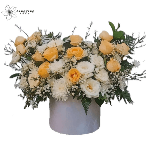 BX_07 menghadirkan energi positif dan semangat baru melalui kombinasi mawar kuning cerah, mawar putih, krisan, dan baby’s breath. Rangkaian ini disusun dalam box putih elegan, menciptakan harmoni warna yang lembut namun tetap mencuri perhatian.