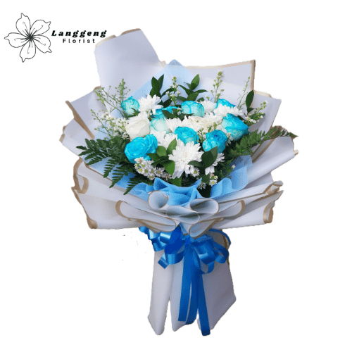 Buket eksklusif ini dirangkai dengan mawar biru tua dan putih yang memberikan kesan mewah dan megah. Wrapping berwarna biru royal ditambah pita satin tebal menjadikannya pilihan terbaik untuk acara resmi seperti penghargaan, ucapan sukses, atau kado spesial untuk orang penting.