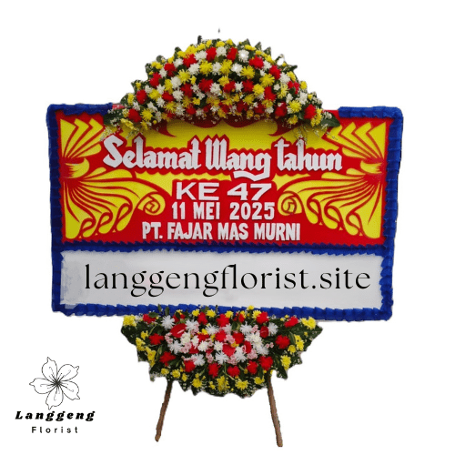 Berikan ucapan selamat ulang tahun yang berkesan untuk rekan bisnis, klien, atau mitra usaha Anda melalui Bunga Papan Ulang Tahun Perusahaan (PT) berukuran 1,2 x 2 meter, dengan desain eksklusif ukiran tirai di kanan kiri ucapan. Kombinasi warna merah dan kuning memberikan kesan hangat, energik, dan penuh semangat.